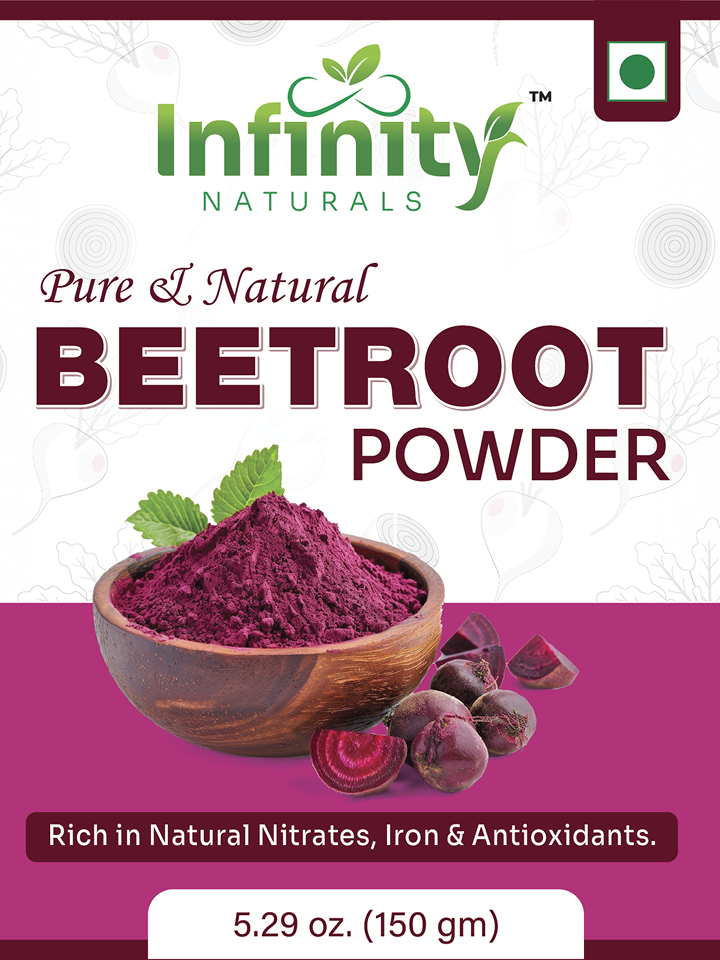 Infinity Naturals Beetroot Powder is made from carefully selected, farm-fresh beetroots that are Dehydrated and finely ground to preserve their natural nutrients and color. A powerhouse of natural nitrates, iron, folate, and antioxidants, this vibrant powder is ideal for enhancing energy, endurance, blood circulation, and heart health. With its sweet, earthy flavor and striking color, Beetroot Powder is perfect for smoothies, juices, pre-workout drinks, baking, or even natural food coloring—completely free from additives and preservatives.